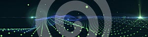 | Abstract background with polygonal noisy grid connecting dots on dark. Big Data. Analytics data algorithms. Computing concept. Banner horizontal for business, science and technology. |