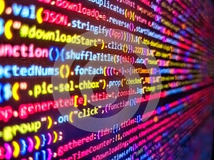 | Application binary code. Modern web network and internet telecommunication technology. Abstract information digital technology modern background. Programming code abstract laptop. Closeup image . |