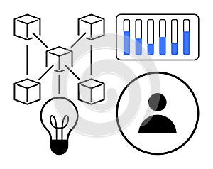 Interconnected blocks, lightbulb for innovation, user avatar, and data charts. Ideal for blockchain, technology, innovation, data analytics, networking user interface simple landing page |