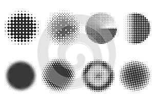 | Circle dots with halftone pattern. Round gradient background. Elements with gradation points texture. Abstract geometric shapes. Vector set. |