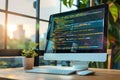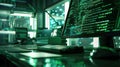 Computer screen displaying green programming code in a cyber workspace. AI generated image. |