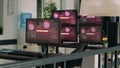 | Computer monitors showing source code in empty it company office, security system compiling data algorithms in background. Artificial intelligence servers cloud computing in programming room |
