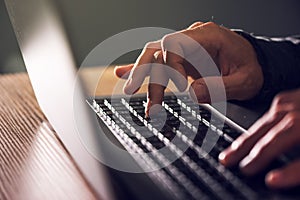 | Computer programmer and hacker hands typing laptop keyboard, close up low key with selective focus |
