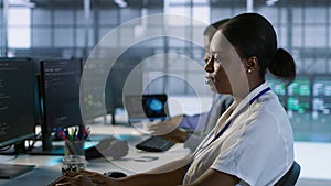 | Computer scientists in data center implementing AI predictive maintenance systems. Server farm employees using artificial intelligence to identify hardware failures impacting operations, camera A |