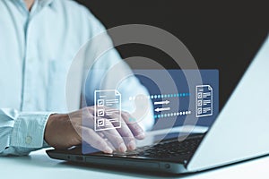 | Data Transfer concept. FTP(File Transfer Protocol) files receiver and computer backup copy. File sharing isometric. Digital system for transferring documents and files online. Businessman using laptop |