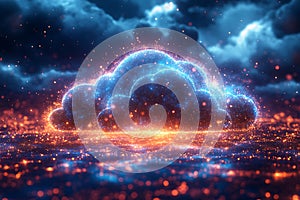 a stylized digital cloud floats amidst a sea of glowing orange particles, backed by moody dark blue clouds the image evokes concepts of cloud computing, data storage, and cuttingedge technology with its futuristic aesthetic and shimmering particle effects , pastel background tone