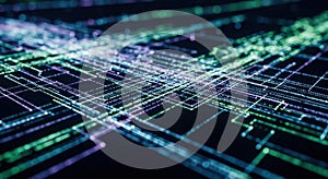 | An abstract digital technology background features a vibrant network of glowing blue, green, and purple lines, resembling a futuristic circuit board or interconnected data streams. This dynamic visual represents concepts like global communication, artificial intelligence, big data, and cybersecurity, perfect for illustrating modern technological advancements and digital transformation. |