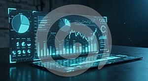 | Futuristic digital dashboard displaying various data visualizations, including bar charts, line graphs, and pie charts. The interface is a holographic projection with a neon blue glow, giving a high-tech, virtual appearance. It's set against a dark background, enhancing its luminosity. The data is organized in panels, suggesting a focus on analytics or monitoring. The overall design is sleek and modern, indicative of advanced technological applications such as AI or data science. |