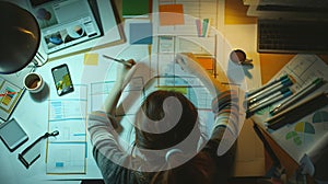 Generative AI : Website designer Creative planning phone app development sketch template layout framework wireframe design User experience concept Overhead view of young woman UX d