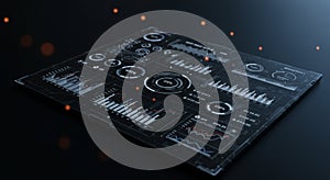 | High-tech, digital interface featuring various data visualization elements such as graphs, charts, and circular progress indicators. The display lies flat, resembling a futuristic, transparent dashboard against a dark background. Bright, neon lights accentuate key areas, and small glowing dots hover around, adding to its sci-fi appearance. The charts illustrate data trends with lines, bars, and numeric indicators, suggesting analytical functionalities, possibly for financial or technological applications. The interface exudes a sleek, modern aesthetic. |