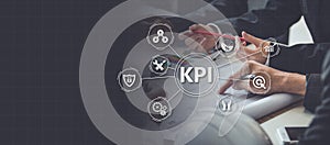 Key Performance Indicator KPI using Business Background with infographic versus planned target, person touching screen icon, success concept.