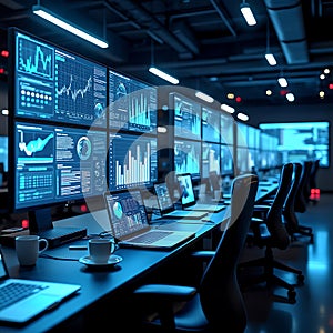 | Advanced Data Analytics Center with High-Tech Monitors and Global Projections. Modern Command Center with Real-Time Global Data Visualization on Multiple Screens. |
