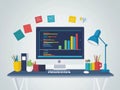 | A sleek modern office workspace featuring a computer displaying insightful data analysis charts and graphs, showcasing a productive and technologically advanced environment. |