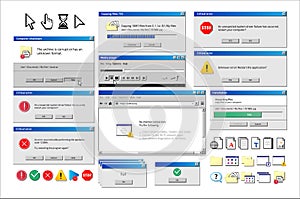 | Old computer window. Popup warning, error and installation windows, media player and file manager classic retro design. Vector illustration vintage tab 90s software UI |