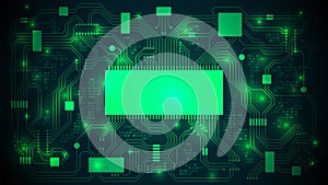 | Printed circuit board with a processor, microchips and binary code. Abstract high-tech electronic background, copy space, template; well organized layers |