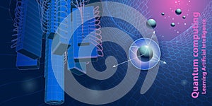 | Quantum computer. Abstract tech background concept with qubit. Learning artificial intelligence element. Cryptography infographic banner. Big data. |