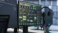| Close up of computer displays in empty data center establishment monitoring hardware energy consumption. PC screens on server hub office desk showing programming software |