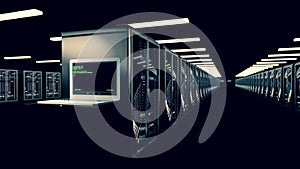 Server racks in server room cloud data center. Rackmount LED console. Datacenter hardware cluster. Backup, hosting, mainframe, mining, farm and computer rack with storage information. 3D rendering. 3D illustration