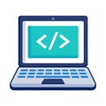 | Software development, web coding on laptop. Programming concept. Website design, coding. Remote work in home. Vector illustration |