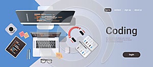 | Web site design development program coding concept top angle view desktop computer monitor tablet laptop screen organizer office stuff horizontal copy space vector illustration |