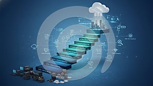 | Digital illustration depicting a futuristic staircase of technological advancement leading to a city in a cloud, symbolizing cloud computing and smart cities. Each stair represents a step in data management and AI development. Left side features computer setups and tech equipment. Surrounding icons and text reference AI, data analytics, CRM, AI ML, and other tech concepts, indicating a digital ecosystem. Blue background emphasizes a modern tech environment. |