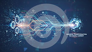 | Futuristic digital illustration depicting business transformation. Circuit-like lines originate from interconnected gears on the left, symbolizing innovation and connectivity. Various labels, such as "Cloud Computing," "Cyber security," and "Data Analytics," highlight modern technological concepts. The lines converge toward a digital globe on the right, representing global connectivity. The background is deep blue, enhancing the high-tech theme. The phrase "Business Transformation: The Digital Current" underscores the focus on digital change. |