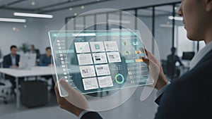 | In a modern office setting, a person holds a transparent tablet displaying various digital interfaces, including documents and a pie chart. The tablet has a futuristic, holographic appearance. In the background, several people are seated at desks, engaging in conversation. The office features glass walls and subdued lighting, contributing to a sleek and high-tech atmosphere. The image conveys a sense of advanced technology and professional environment. |