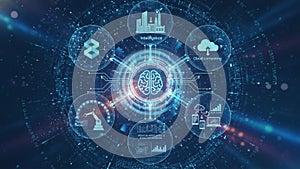 | Futuristic digital interface featuring a central brain icon, surrounded by interconnected technology-related elements. Icons represent various concepts such as artificial intelligence, machine learning, cloud computing, and robotics. Each icon is encased in a circular, network-themed design, connected by glowing lines, symbolizing interconnectivity. Dominant colors are blue and white, set against a dark, digital-themed background, evoking a sense of technology and innovation. The arrangement emphasizes the integration and interaction of modern technological advancements. |
