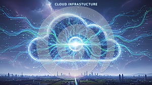 | A digital illustration depicting a large cloud shape representing "Cloud Infrastructure", hovering above a cityscape. The cloud is interconnected with glowing lines and circuits, symbolizing digital connectivity and data flow. The city below is detailed with skyscrapers and buildings, set against a dusky sky transitioning from light to dark. The scene conveys a futuristic and technologically advanced concept highlighting the integration of cloud computing with urban environments. |