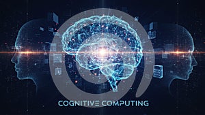 | Futuristic digital artwork depicting cognitive computing. Central focus on a glowing, blue wire frame brain with intricate neuron-like connections. On either side, silhouettes of human heads facing each other, suggesting communication or data exchange. Background features abstract geometric shapes and elements resembling a digital interface, emphasizing high-tech and artificial intelligence themes. The text "Cognitive Computing" is displayed at the bottom, enhancing the technological context. |