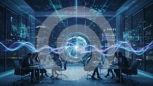 | A futuristic office scene showcases people working at desks with laptops. The backdrop features large windows displaying a city skyline at night. A digital globe, surrounded by holographic data overlays and neon colored waves, hovers in the center, emphasizing a high-tech environment. The room's ambiance highlights innovation and connectivity, with a focus on global networking and advanced communication technologies. The combination of physical and digital elements creates a dynamic and integrated workspace atmosphere. |
