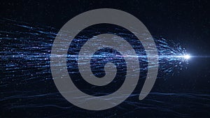 | An abstract digital art piece featuring a dynamic array of blue and purple light streaks converging towards a bright focal point on the right. The background is a deep, dark space with scattered, subtle light particles suggesting motion and speed. Below, a wavy, dotted pattern adds depth and texture, reminiscent of a digital landscape or digital data stream. The overall imagery creates an impression of futuristic motion and technology. |