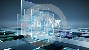 | Futuristic digital interface with translucent panels displaying a world map and bar graphs. The scene appears as a high-tech virtual environment, featuring a grid pattern on a reflective surface with light blue and white hues. Panels, seemingly holographic, hover above the surface, creating a sense of depth and dimension. The background is blurred, enhancing the focus on the digital elements, while subtle lights and dots suggest data flows or network connections. This digital landscape evokes the concept of global connectivity and information technology. |