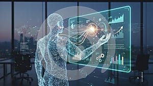 | A wire frame digital human figure interacts with a virtual interface in an office setting. The holographic display showcases various data visualizations, including graphs, charts, and gears, suggesting a focus on technology or analytics. The scene is set against large windows with a cityscape view, indicating a modern, urban environment. This setup highlights themes of digital innovation and futuristic technology in a professional context. |