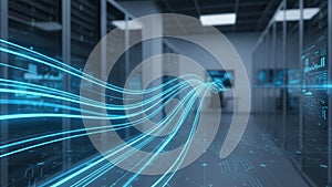 | A futuristic data center with a digital wave of blue light streams flowing through the room, symbolizing data transfer. Glass-walled server racks line the sides, filled with computer equipment. Monitors displaying data visualizations are visible in the background. The room features a gray and metallic color scheme, highlighting advanced technology. Ceiling lights are reflected on the polished floor, enhancing the high-tech ambiance. |