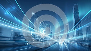 | Futuristic cityscape at night, featuring sleek skyscrapers and smooth highways under a dark blue sky. Neon blue light trails and digital overlays create a sense of motion and advanced technology. The towering buildings, with sharp angles and reflective surfaces, are illuminated by ambient lighting. Elements suggest a high-tech urban environment with advanced infrastructure and potential digital interfaces integrated into the cityscape. This scene conveys a vision of a technologically advanced future. |