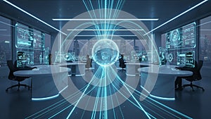 | Futuristic office setting featuring advanced technology. Central sphere with emanating blue holographic lines connects to multiple digital interfaces on curved desks. Walls lined with large transparent screens display various data and graphics. The room has a sleek, modern design with an urban cityscape visible through the windows, suggesting a high-tech, metropolitan location. Office chairs are positioned at the desks, hinting at a collaborative, digital work environment. |