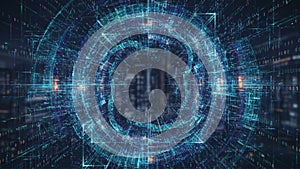 | Futuristic digital interface with a maze of neon blue and orange circuits forming a circular, three-dimensional design. The background shows a blurred cityscape at night, emphasizing a theme of advanced technology. Binary code lines the edges, creating a sense of motion and depth. This design is often associated with concepts like artificial intelligence, digital networks, and cybernetic communication systems. The glowing elements and intricate patterns suggest complexity and connectivity in a digital realm. |