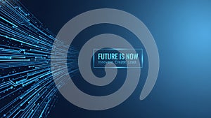 | Digital illustration showing a futuristic theme with a deep blue background. On the left, an array of interconnected lines and dots resembling a circuit design flows horizontally, symbolizing technology and connectivity. To the right, a glowing rectangular text box displays the message "FUTURE IS NOW" in bold font, followed by smaller text "Innovate. Create. Lead." The overall design conveys a modern, tech-forward aesthetic, emphasizing innovation and leadership. |