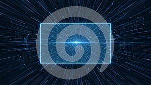 | A glowing, rectangular frame surrounded by streaks of light on a dark blue background gives a sense of motion and speed. The light rays emanate from a central point within the rectangle, creating a tunnel or warp-speed effect. The digital design mimics a futuristic or sci-fi theme, possibly representing travel or data transmission through space. Patterns of dots and lines in the background suggest a digital matrix or network, enhancing the high-tech feel. |