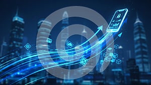 | Futuristic digital illustration showcasing smart city concepts with glowing blue elements. A smartphone with a lock, graphs, and technological icons is prominently displayed, symbolizing data security and connectivity. Flowing digital streams and arrows move between tall, illuminated skyscrapers, highlighting themes of innovation and technology integration. The urban skyline suggests a modern cityscape, with a focus on advanced infrastructure and smart solutions. |